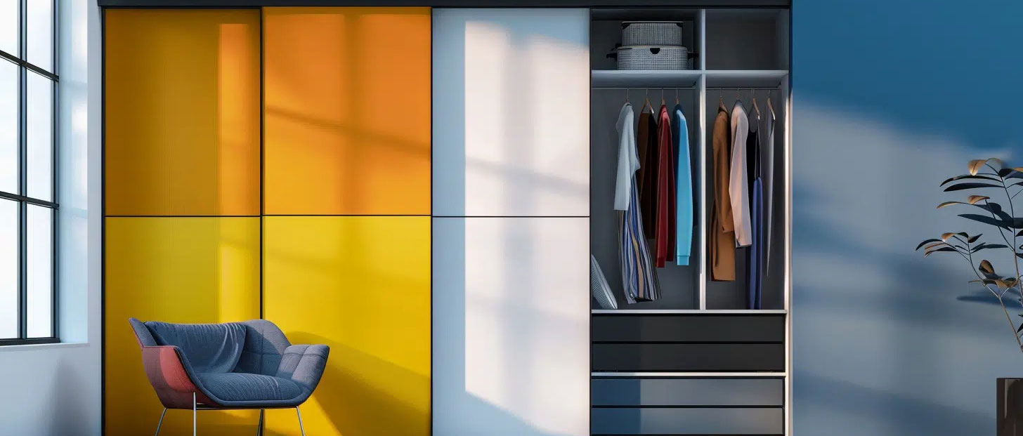 It has sliding doors that slide from side to side on metal tracks linked to the top and bottom of the wardrobe, rather than hinges.